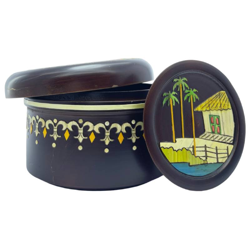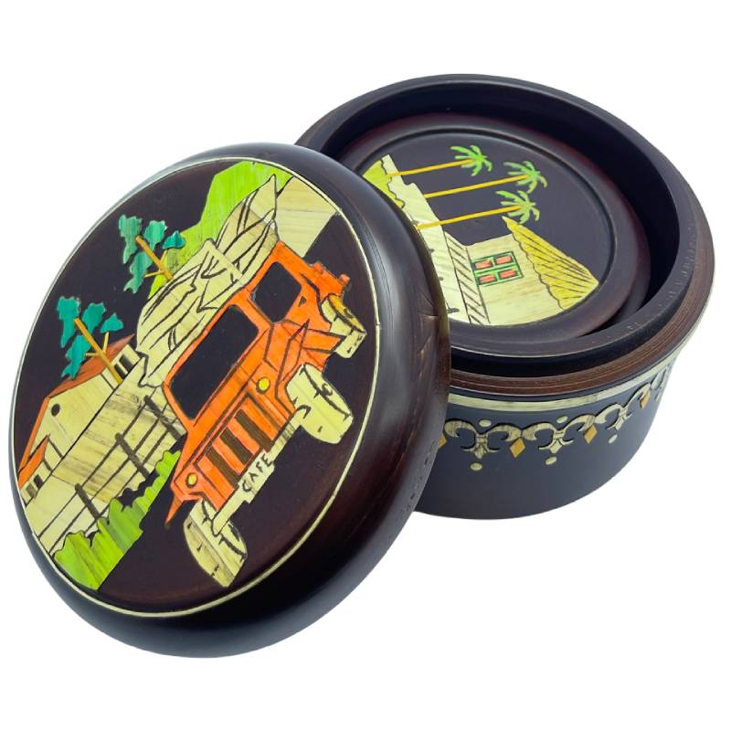 Incluye 6 posavasos en un estuche decorativo con tapa tallada a mano.