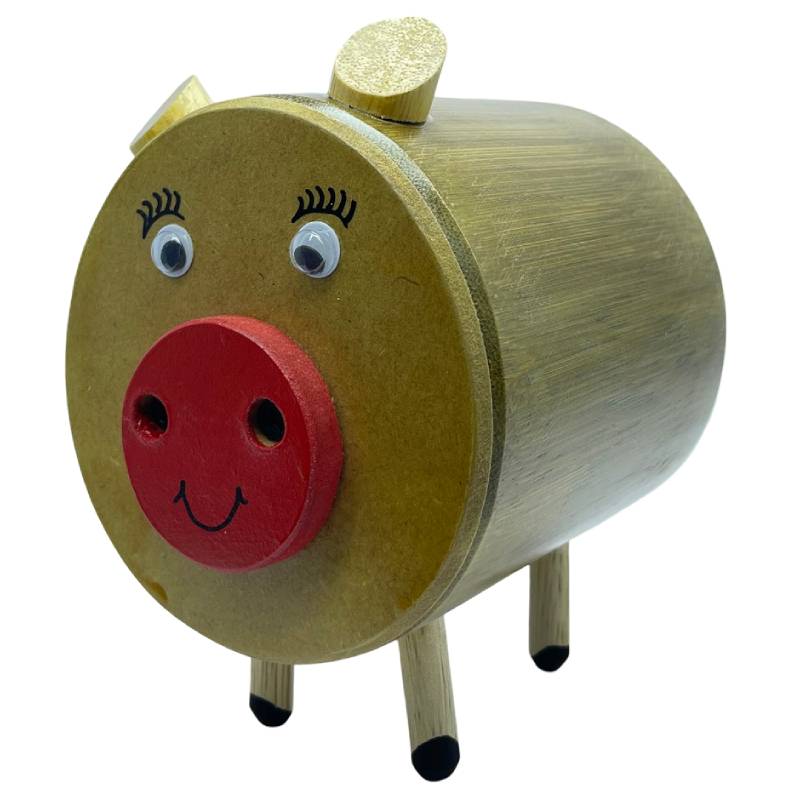 • Forma cilíndrica con patas, orejas y cola simulada en madera natural.