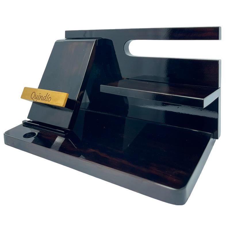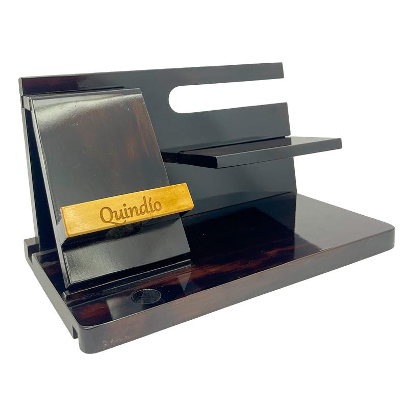 Ideal para mantener tu espacio de trabajo en orden con estilo. Este organizador de escritorio de madera es desarmable, fácil de armar, resistente y con acabado brillante. Incluye soporte para celular y compartimientos para artículos como esferos, llaves, reloj o cartera. Grabado con la palabra “Quindío” en detalle dorado.