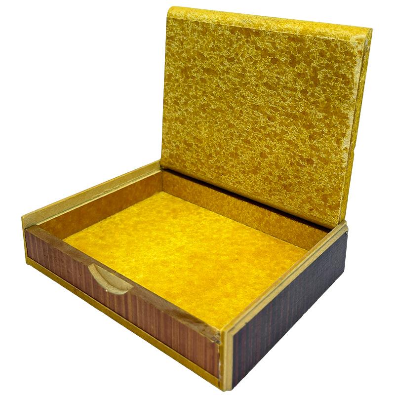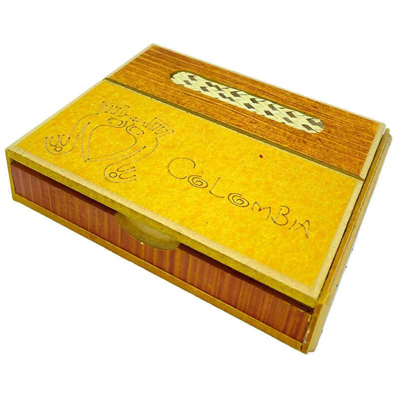 Guarda tus tabacos favoritos con estilo gracias a esta refinada caja de madera. Su interior forrado en terciopelo amarillo no solo protege, sino que resalta el valor de lo que contiene. Ideal para coleccionistas, regalos o como elemento decorativo.